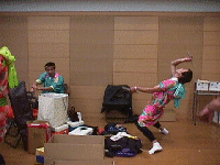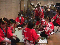 皆、簡単に衣装に着替え、太鼓・笛・三味線を用意し舞台に上がります。